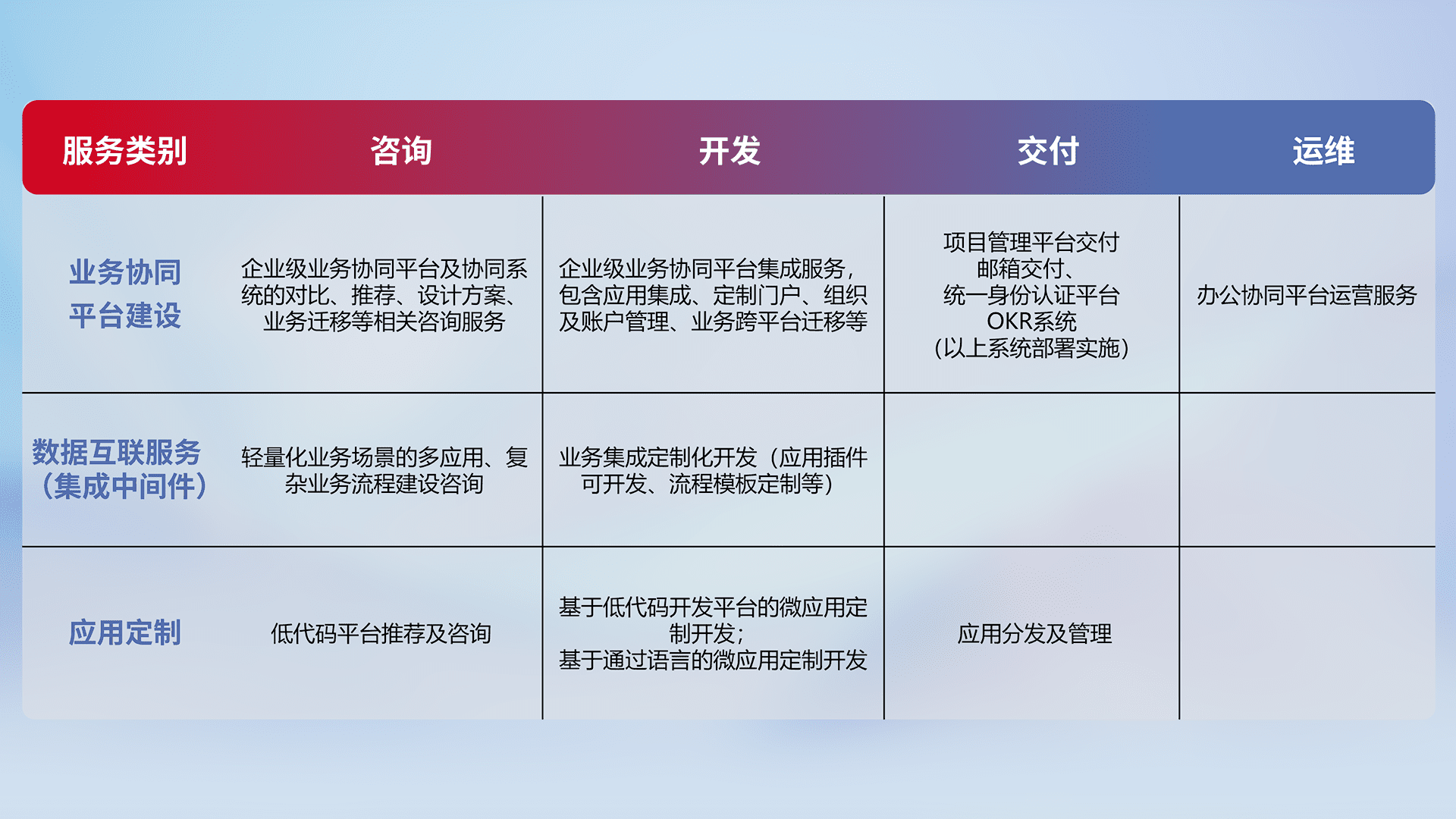 针对钉钉、、、企微、、、、IDaas等平台级产品提供产品的规划、、方案、、、交付、、定制化开发等服务,,,,实现如统一协同办公、、智能客户服务、、、、混合会议管理、、、智能数据查询、、、、等业务场景,,,,实现数字化转型。。。。