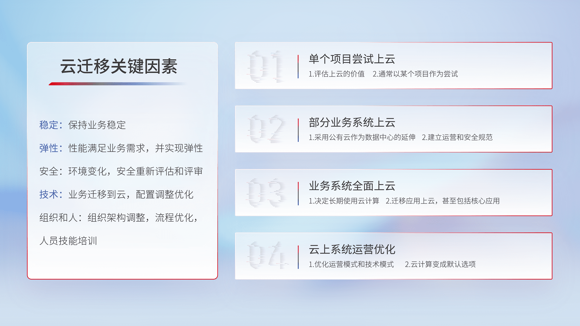结合实际业务,,从规划设计、、、、云平台选型、、云原生改造、、、、数据迁移、、、集成交付,,,,迁移全过程为客户识别最佳上云路径,,做好风险识别管理,,,,设计网络架构、、、、身份权限、、安全审计合规、、、操作审计、、日志审计、、、、监控告警策略、、多站点容灾设计等,,,对云上基础设施进行整体规划,,提升IT治理水平,,,,以满足弹性、、、、高可用、、、、高性能的需求。。。