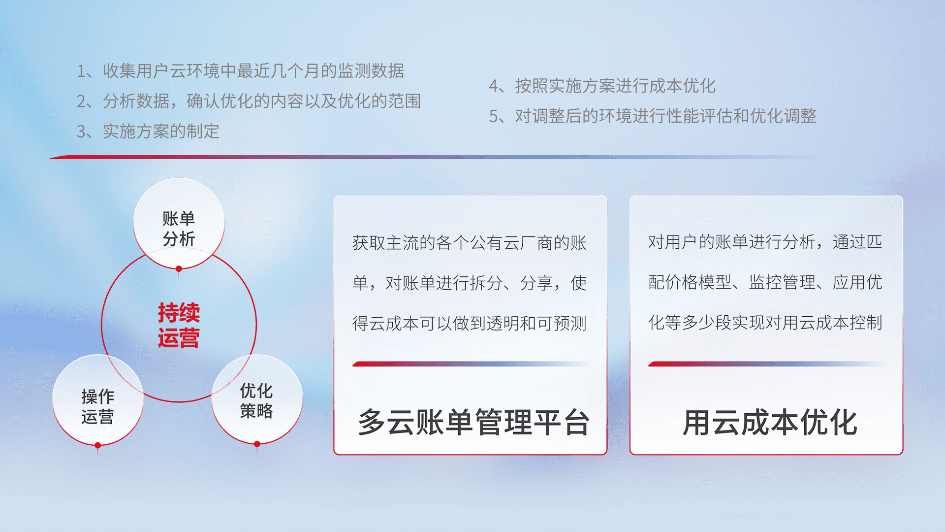 通过多云纳管,,,以统一的资源数据模型把客户的云资源进行抽象和封装,,进而实现对多云资源的统一操作,,,,保障云资源管理的可靠性、、稳定性与可用性。。。量身定制化运维内容,,配置、、、、开发运维、、、补丁管理、、、、备份、、、监控、、、认证和访问管理、、、、审计和日常巡检等,,,保障在用云过程中的可靠度,,稳定度以及高可用率。。。